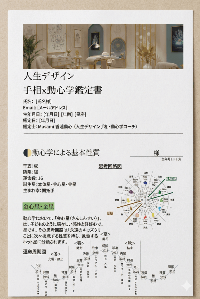 手相・動心学・対話内容をまとめた“あなただけのレポート”をお渡しします。